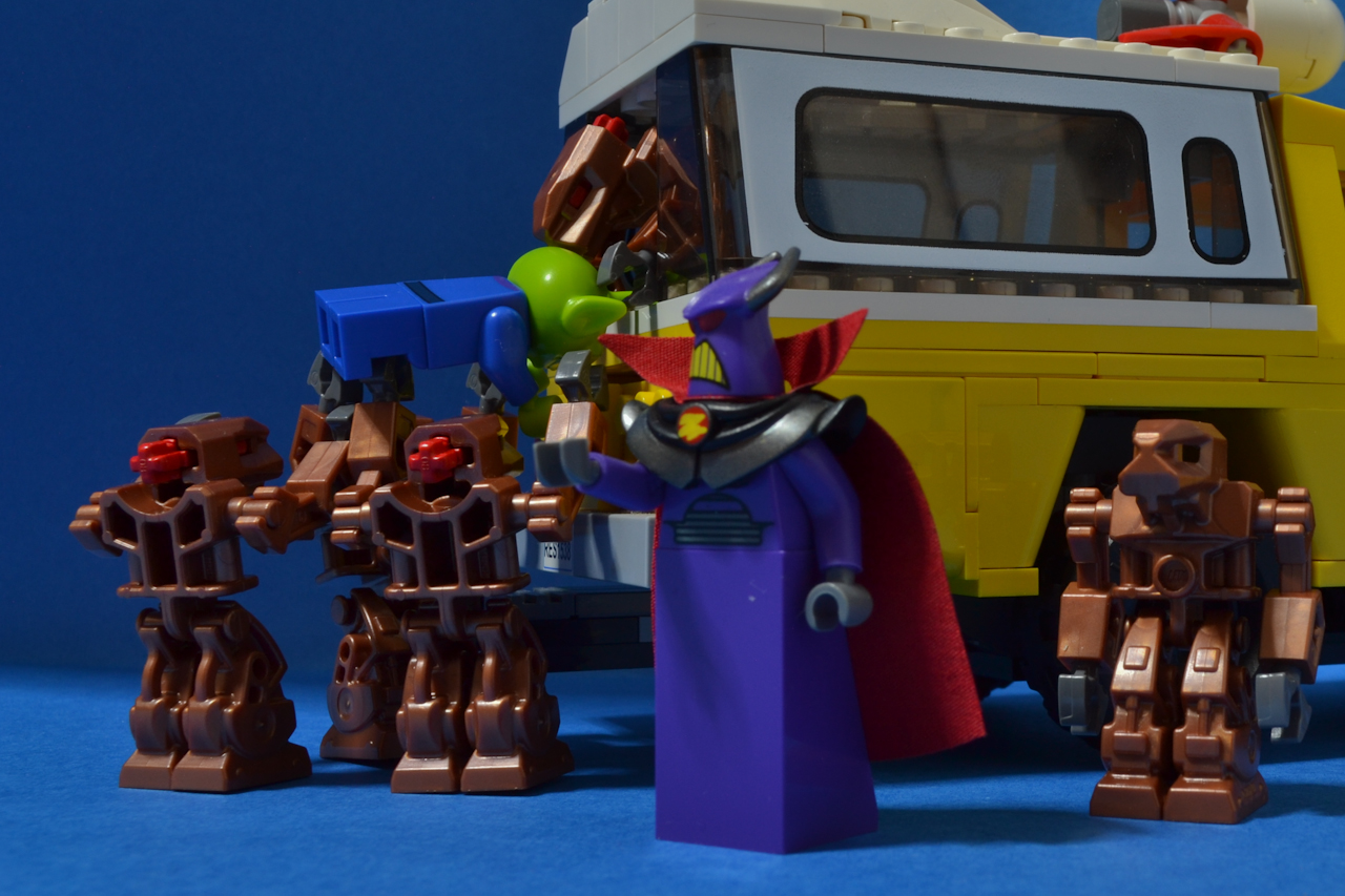 La tranquilidad del juego se vio interrumpida  cuando una especie de cuerda atrapó al marciano e hizo que saliese despedido por la ventana. Todos corrimos para ayudarle y entonces lo vimos: en el jardín Zurg apresó a nuestro amigo y lo metió en una camioneta con ayuda de varios robots matones.