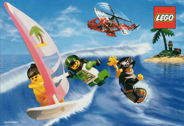 La portada resume de un vistazo las líneas principales de la época, con minifigs de Medieval, Space Police, Piratas, Paradisa haciendo surf, mientras el helicóptero TECHNIC los vigila.