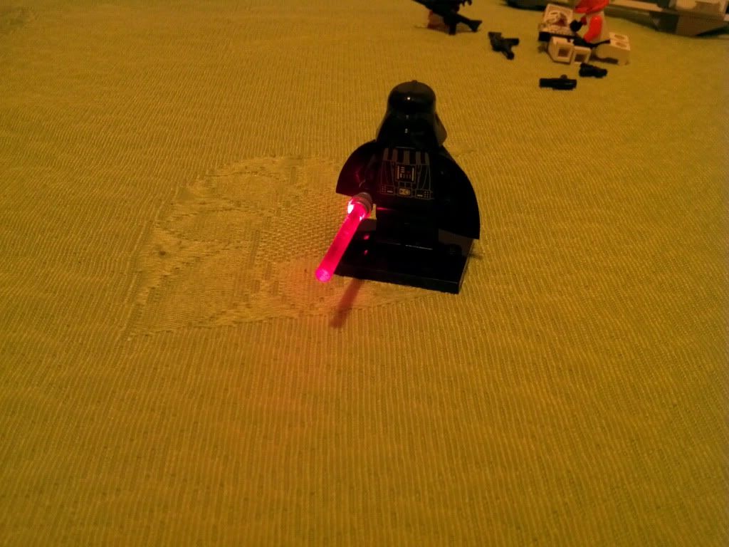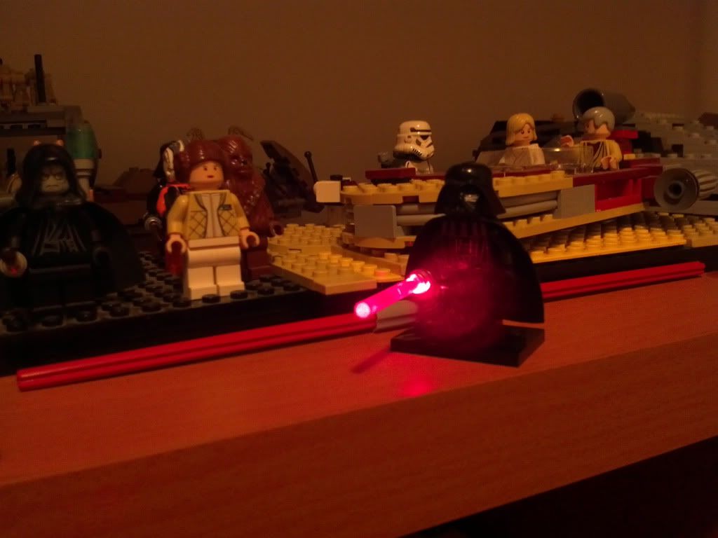 La minifig de Vader es la del TIE Advanced de 2008 con su sablelaser normal y corriente. Lo que he hecho para la foto es apuntarle con un láser rojo de toda la vida y si lo haces con el angulo correcto se crea ese efecto por refracción (la luz no sale del tubo del sablelaser). Es el mismo láser que use para simular la bengala de los clones.