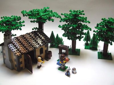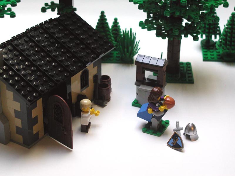 Una escena completa: su casa con chimenea, esquinas reforzadas con sillería, barriles, su pozo, su bosque... lo quiero -_-'
