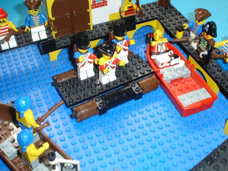 En el muelle principal, los soldados, en formación dispararon contra las balsas que se acercaban, matando a varios piratas, pero no pudieron frenar su avance, y finalmente estos tomaron tierra, saltando sobre los soldados que defendieron sus posiciones a duras penas.