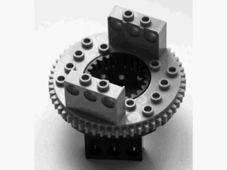 Ahora he retomado el tema y me he puesto a mirar cómo integrar esas válvulas debajo de los cilindros que hacen girar la cabina. El primer paso para lograrlo (o para satisfacer mi deseo de hacerlo todo studless) era rediseñar ese mecanismo con un turntable studless. El primer problema que se presentó era que dicho turntable tiene un stud menos de espacio entre los puntos de anclaje. Además esos puntos están justo encima y debajo del turntable mientras que en la versión con studs hay una distacia de un brick libre.