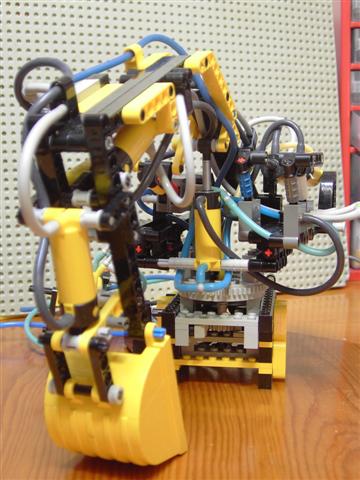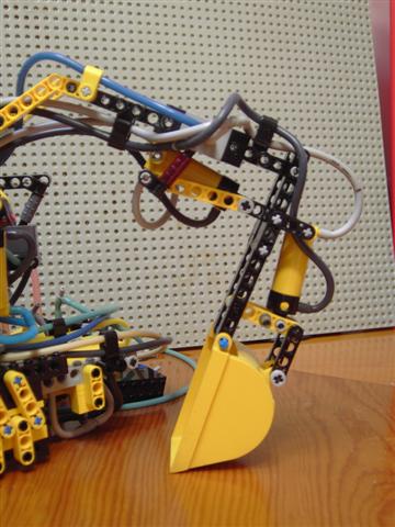Después de muchas `pruebas me salía mejor hacer el brazo studless, aunque por razones de geometría, la única válvula con studs de todo el conjunto está precisamente allí. Esa válvula es la encargada de abrir y cerrar el cazo, y como se puede ver es controlada por el pistón que mueve el segundo tramo del brazo: