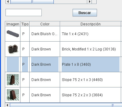 La opción de actualizar el catálogo sólo sirve cuando no encuentra un set, o cuando algún inventario no se carga correctamente, porque generalmente es porque alguna de las piezas no aparece en la base de datos. La información sobre las imágenes no se guarda en la base de datos. Cuando se necesita una imagen, el programa comprueba en primer lugar si la tiene en el disco duro y, si no es así, se la pide a Bricklink. Si no hay conexión o no existe en BL, no pone ninguna imagen.