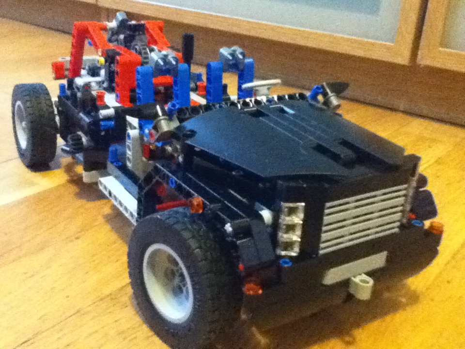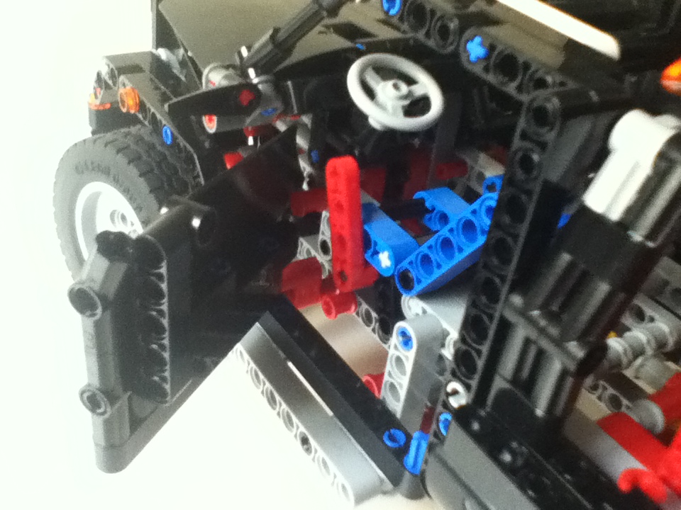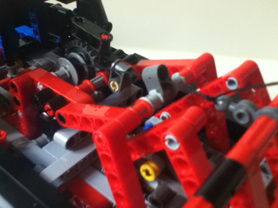 La construccion comienza de una manera interesante. Como es habitual en technic se empieza a construir desde dentro hacia fuera. Al finalizar el primer libro ya tenemos colocado el falso motor y el sistema de giro. (Siento la calidad de esta ultima foto  :E)
