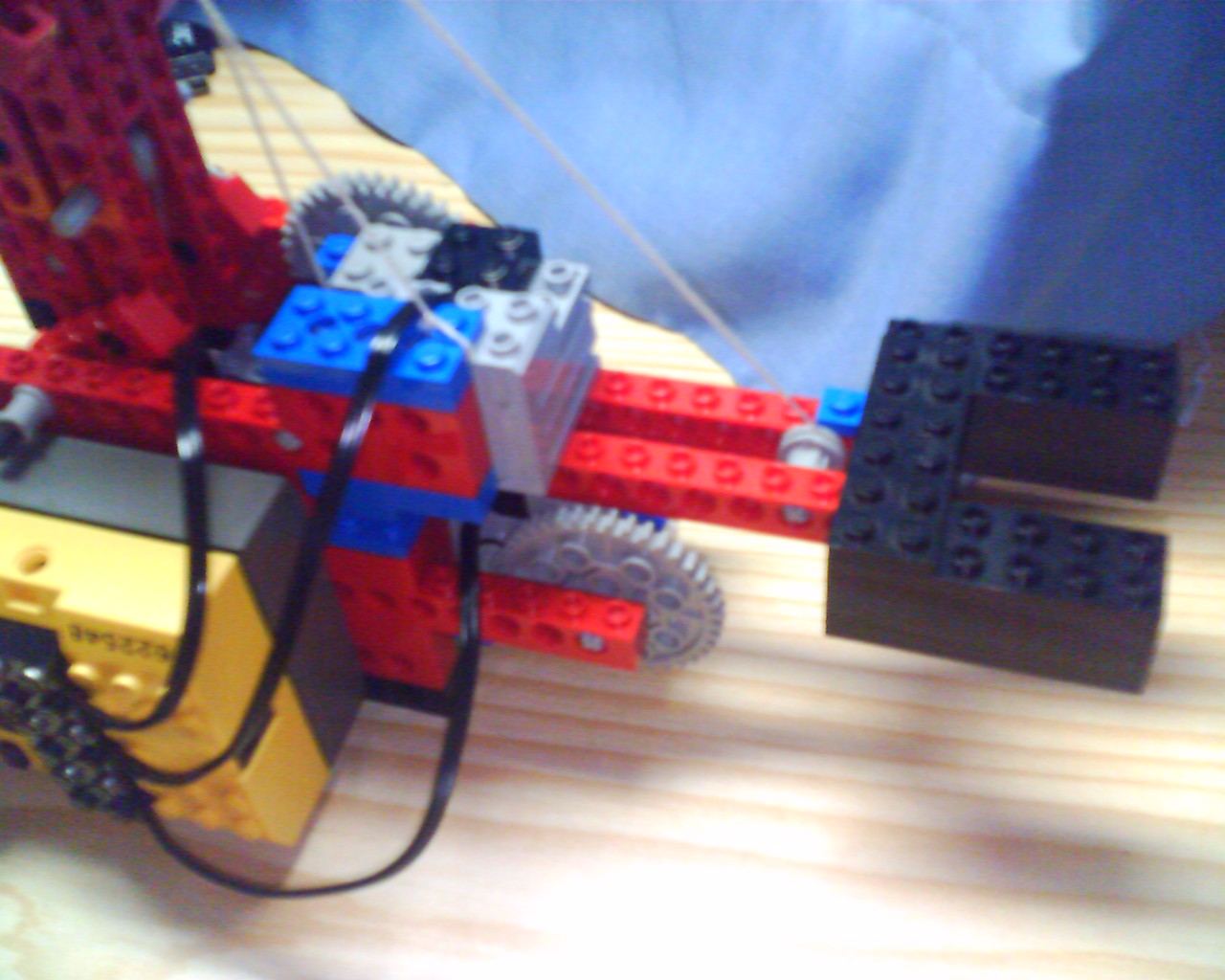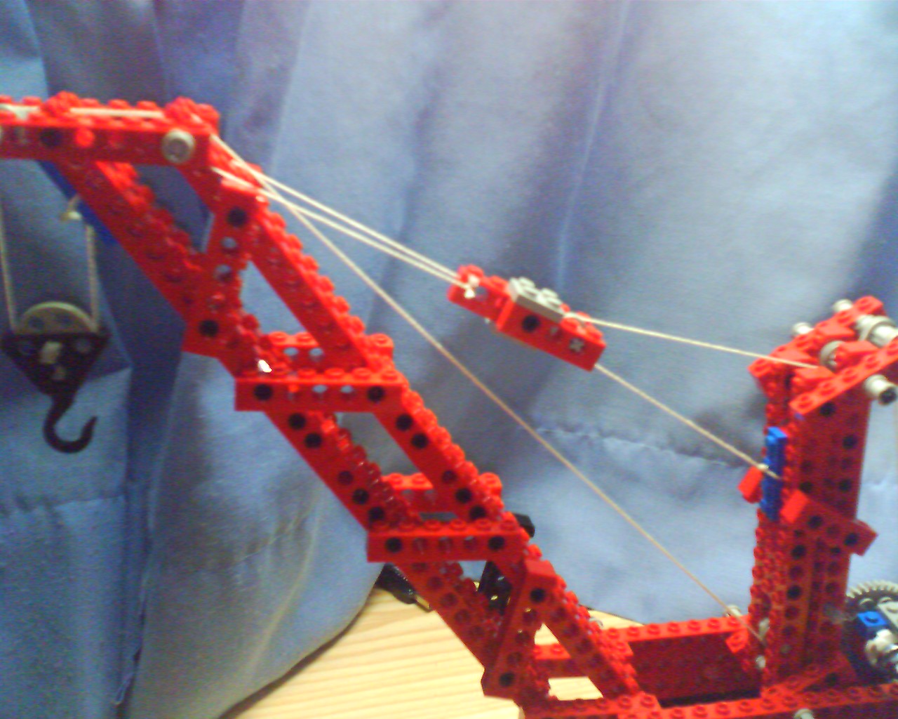 Por cierto, si a la contrapluma la hacemos que pase de los 90° (respecto al suelo), entonces la grúa vuelca. Pero claro, no tiene mucho sentido hacerla pasar de 90° ya que lo que hacemos es cambiar drásticamente el centro de gravedad de la grúa para no ganar nada a cambio (ni más estabilidad ni más alcance para la pluma ni nada). Se me ocurrió hacerlo ayer después de leer el post de Legotron... y ahora está todo preparado para hacer el modelo secundario, vamos... que se me cayó de la mesa. Mucho ojito.